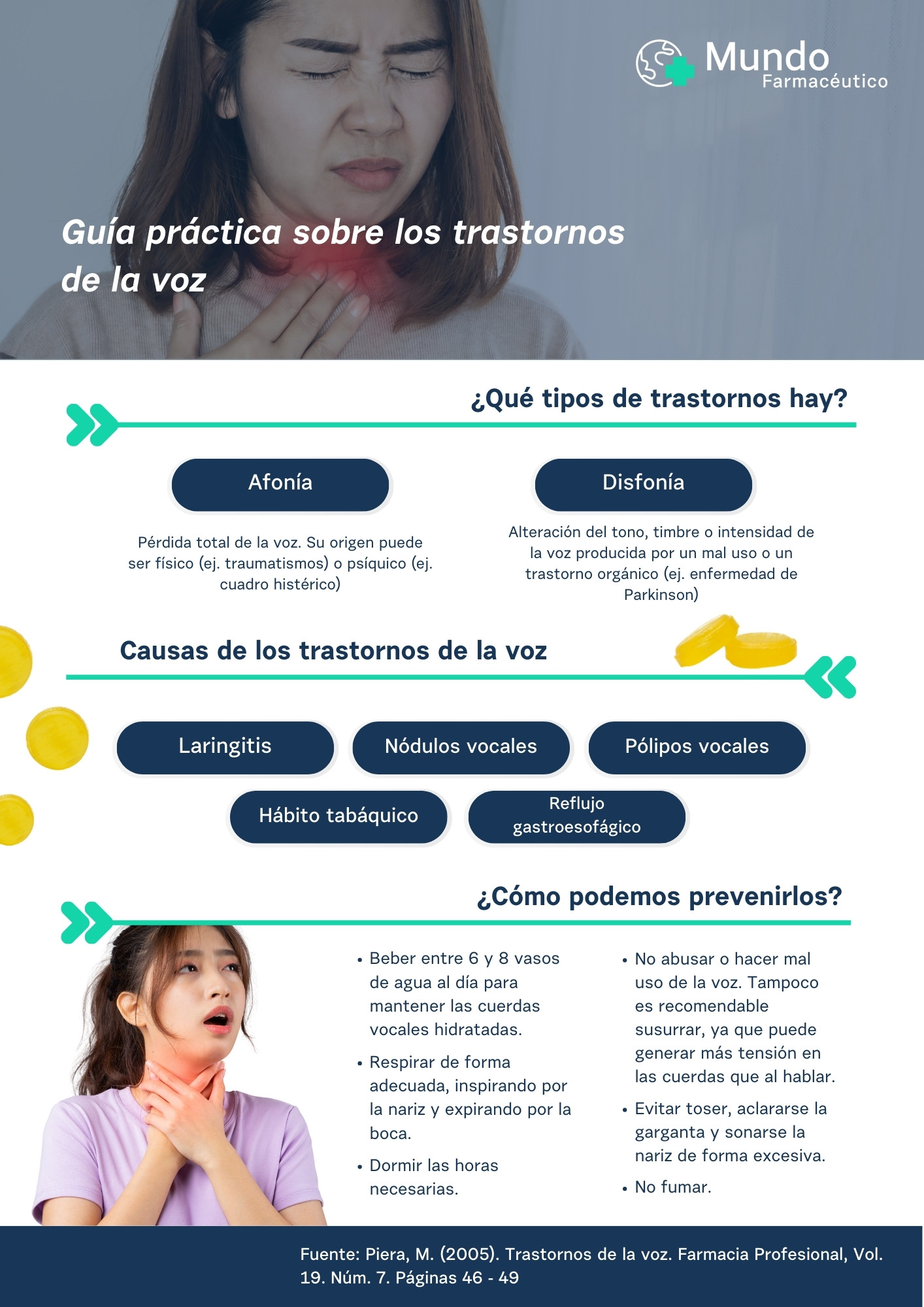 Para ello, la Dra. Mercè Piera, médico de atención primaria, ha elaborado una guía práctica sobre los trastornos de la voz para que desde la farmacia podamos disponer de una base para fundamentar los consejos al paciente. Te lo resumimos en una infografía que puedes descargarte aquí para compartir con tus pacientes.
